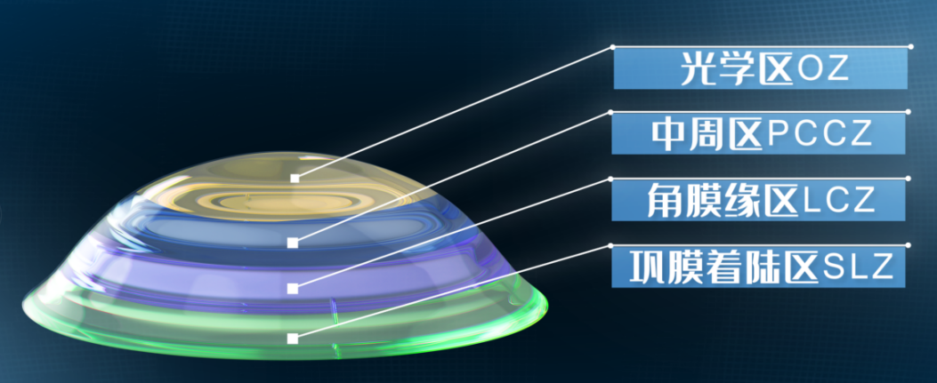 艾康特巩膜镜为四区设计(图2),在光学区和角巩膜缘区之间增加中周区,可以包容更复杂的不规则角膜,也可使得验配更加简单精准。
